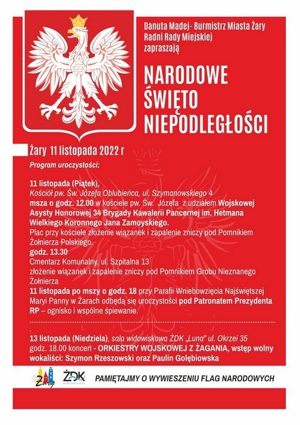 W piątek, 11 listopada, Narodowe Święto Niepodległości. Pamiętajmy w modlitwach o Ojczyźnie i o tych, którzy walczyli oraz polegli w Jej obronie. Pamiętajmy o wywieszeniu flag narodowych. Zapraszamy do wzięcia udziału w uroczystościach organizowanych przez miasto (początek w kościele św. Józefa o g. 12:00 – Msza Św. za Ojczyznę).